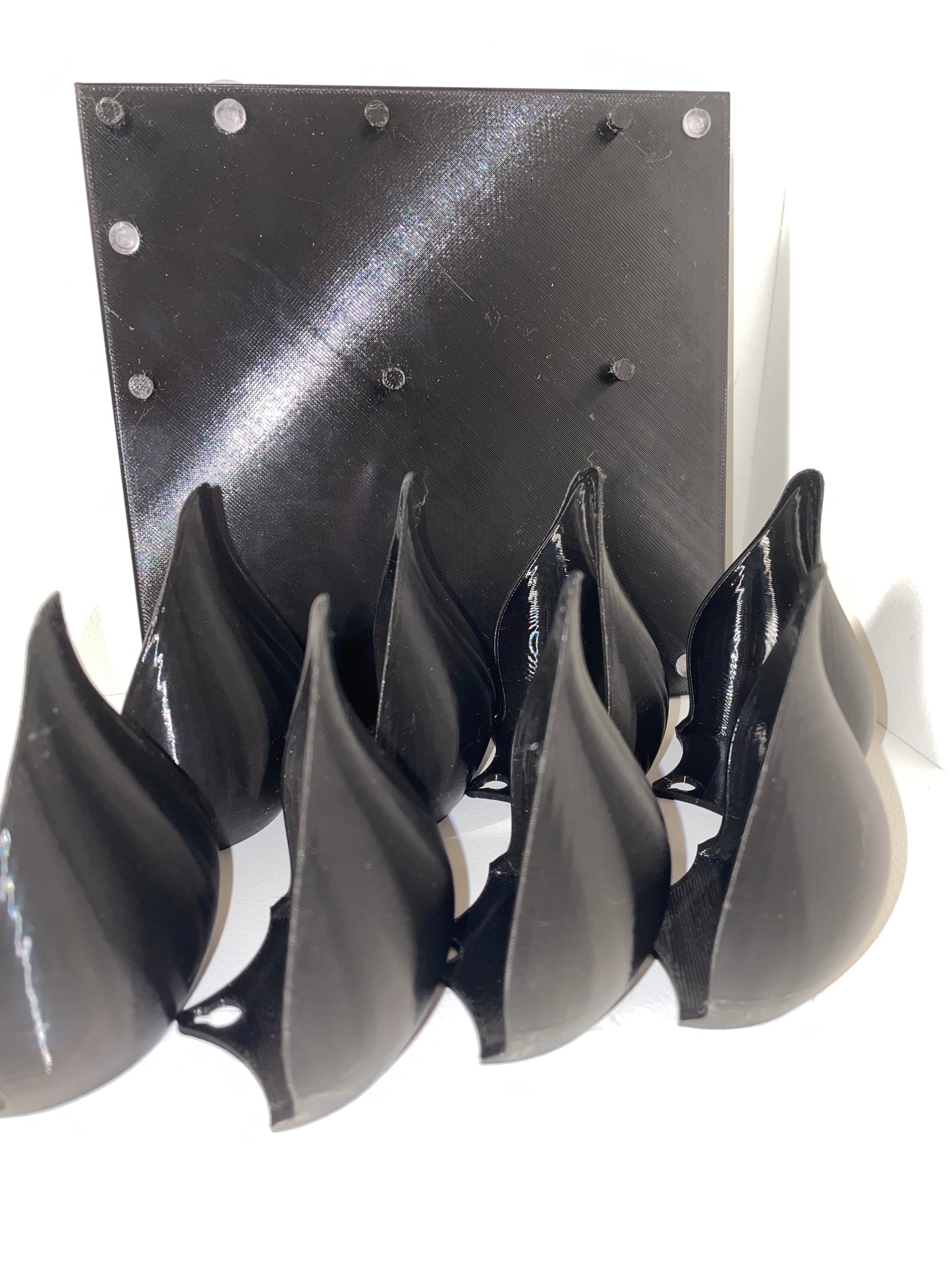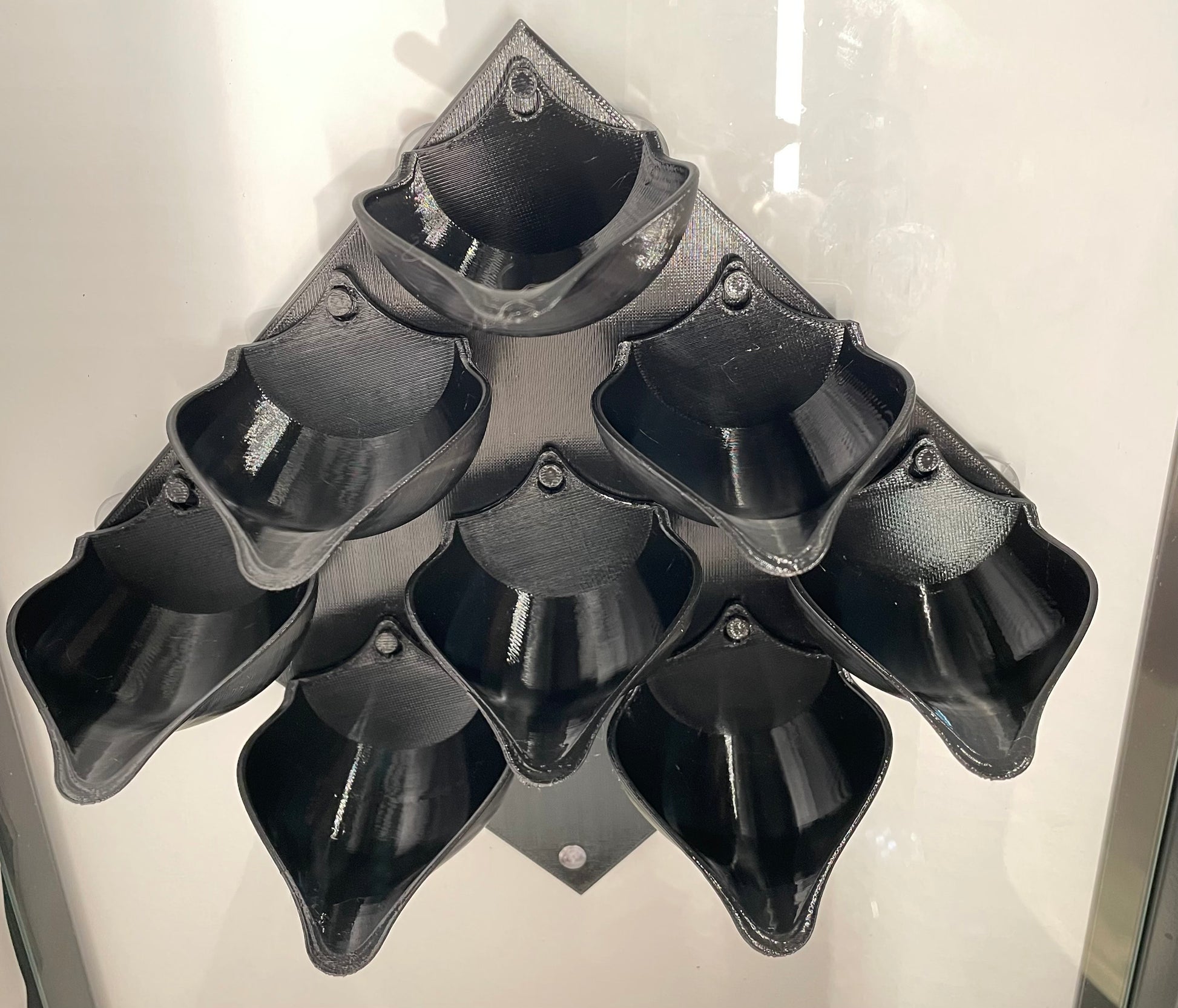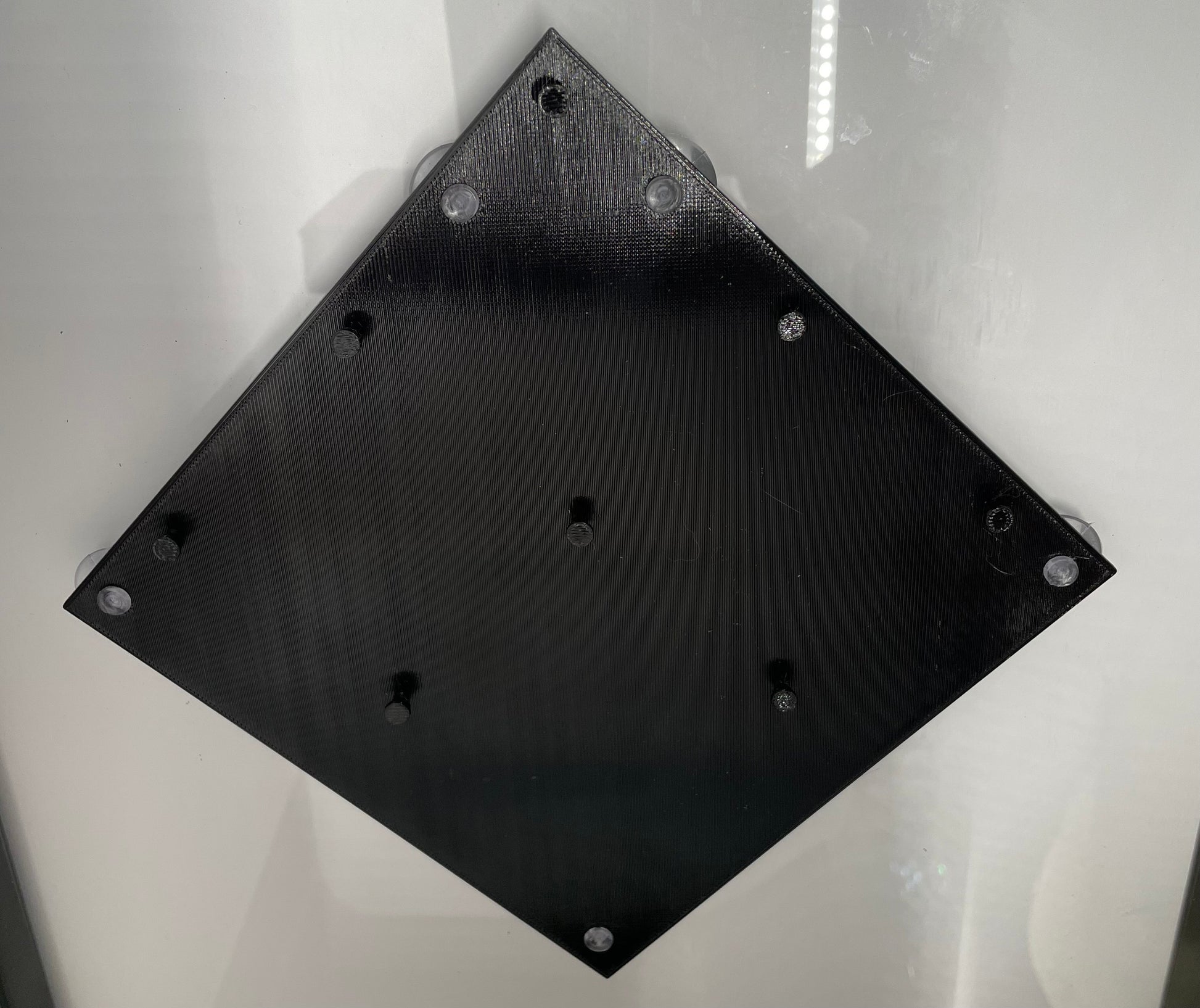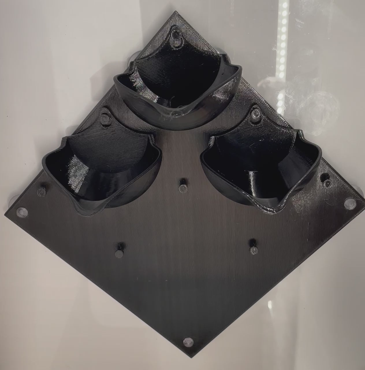 Our solution was a hooded mount with removable pools. The hood and the dark color of our Tadwalls provide privacy and security for the frogs, allowing them to feel safe while laying and tending to their eggs. The removable pools allow you to remove a single clutch from the tank for monitoring, and replace it with a new pool without fighting suction cups. A slight indention on the tops of the pegs ensure your pools will not fall off, and the back of the wall is secured to glass with 3 suction cups.